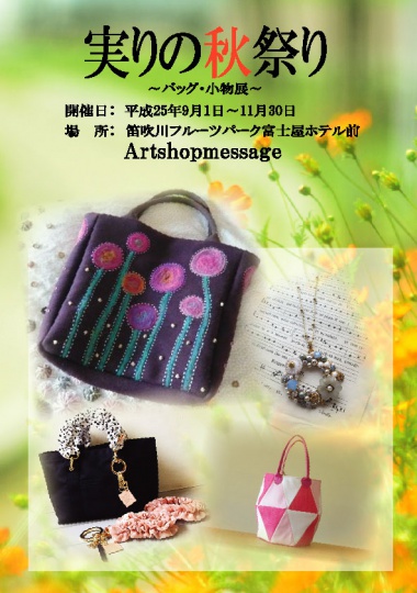 9月実りの秋祭り~バッグ・小物展~ 2013/9/5 2017/7/5 お知らせ, イベント紹介, ハンドメイド 9月よりアートショップでは新企画展を開催しております。 新たに2名の作家様を迎え 秋らしい素敵なバッグと アクセサリー・ワイングラスを展示いたしております。 残暑が厳しいですが 一足早い秋をお楽しみくださいませ。 【参加作家】 中村真紀・バッグ・ワイングラス ayatatsubo・アクセサリー ちろりん・バッグ・カメラストラップ certa・バッグ 以上4名の作品を展示しております。 皆様のご来店心からお待ちいたしております。 共有: クリックして X で共有 (新しいウィンドウで開きます) X Facebook で共有するにはクリックしてください (新しいウィンドウで開きます) Facebook 関連